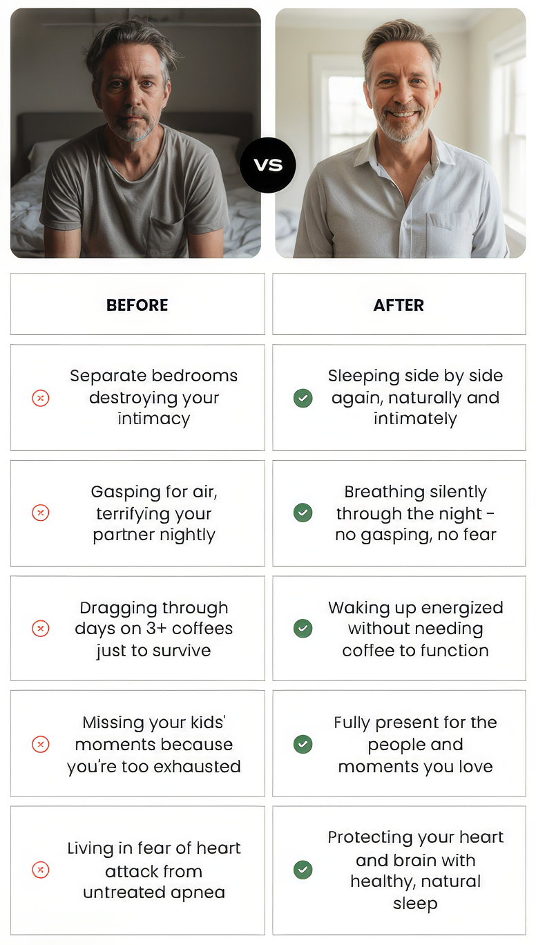SleepEase Pro eliminates snoring and sleep apnea in 99% of users—no mask suffocating you at night, no machine waking your partner, no lifelong dependency costing you thousands.